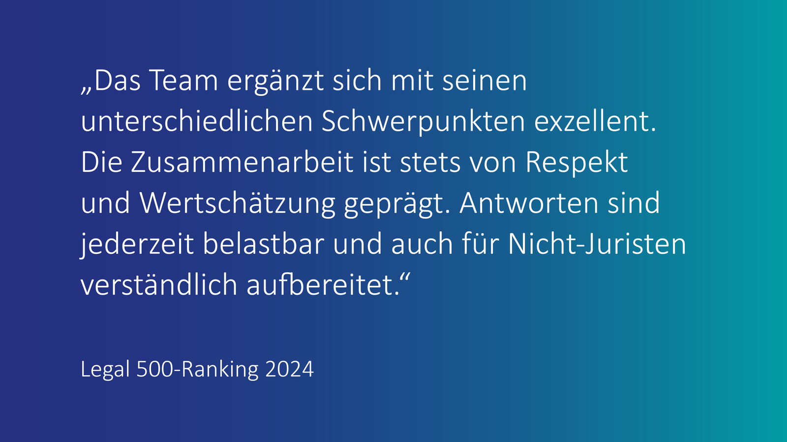 Was uns ausmacht? Ein starkes Team und die Freude daran, über den eigenen Fachbereich hinauszuwachsen. Unsere Expertinnen und Experten sind oft in mehreren Bereichen qualifiziert und stehen in intensivem Austausch miteinander. Vielfach ausgezeichnet gehören wir zu den Besten unserer Disziplinen. So können Sie sich darauf verlassen, dass Ihr Anliegen ganzheitlich durchdacht und mit Weitblick umgesetzt wird.
